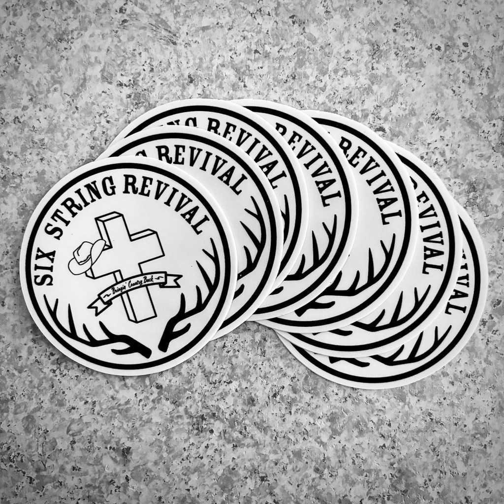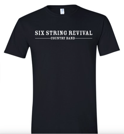 Available at full band shows and personal order. Contact manager at Sixstringrevival6@gmail.com for an order. Colors include white on black with front and back print.